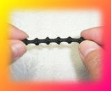 XTENEXは約1cmごとにこぶがあります。ひもを左右に引っ張ってゴムを伸ばすとこぶは消えてまっすぐな同じ細さの1本のひもになります。